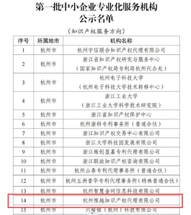 喜報(bào)?。£P(guān)于杭州惟越知識(shí)產(chǎn)權(quán)代理有限公司入選浙江省首批中小企業(yè)專業(yè)化服務(wù)機(jī)構(gòu)的公示
